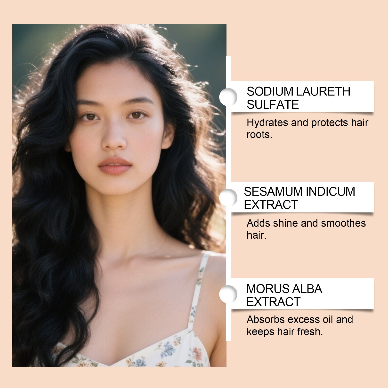 Ingredients: water, sodium lauryl polyether sulfate, 2,4- diaminophenoxyethanol hydrochloride, 1,2-hexanediol, polyquaternary ammonium salt -10, hydroxyethyl cellulose, CI 77499, sesame extract, mulberry extract and pecan seed oil.