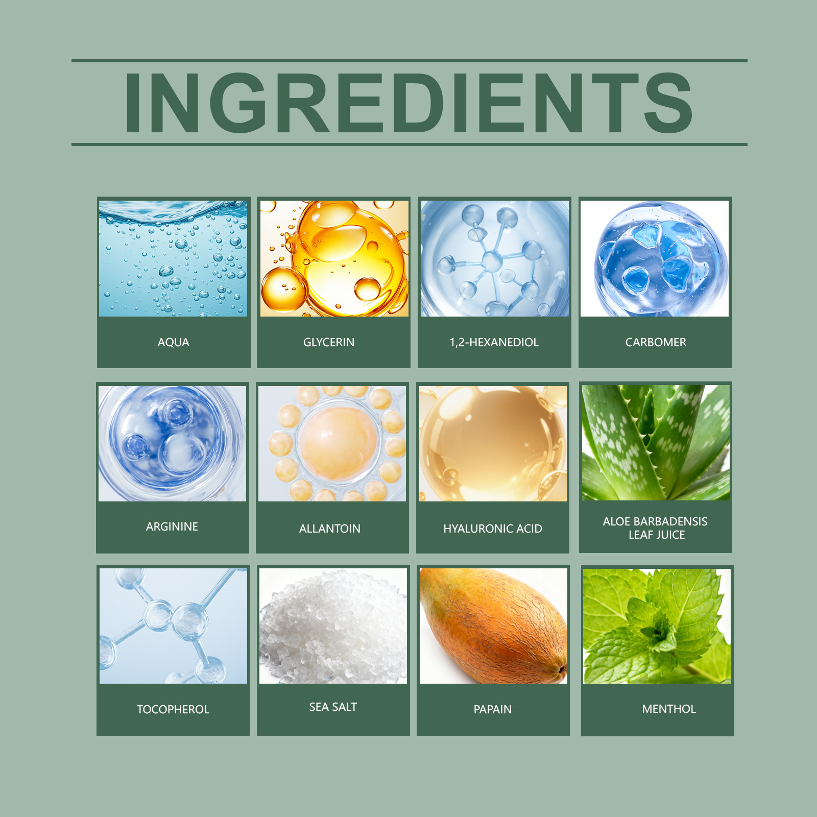 Zutaten: Wasser, Glycerin, 1,2-Hexandiol, Carbomer, Arginin, Allantoin, Hyaluronsäure, Aloe-vera-Blattsaft, Tocopherol (Vitamin E), Meersalz, Papain und Menthol.