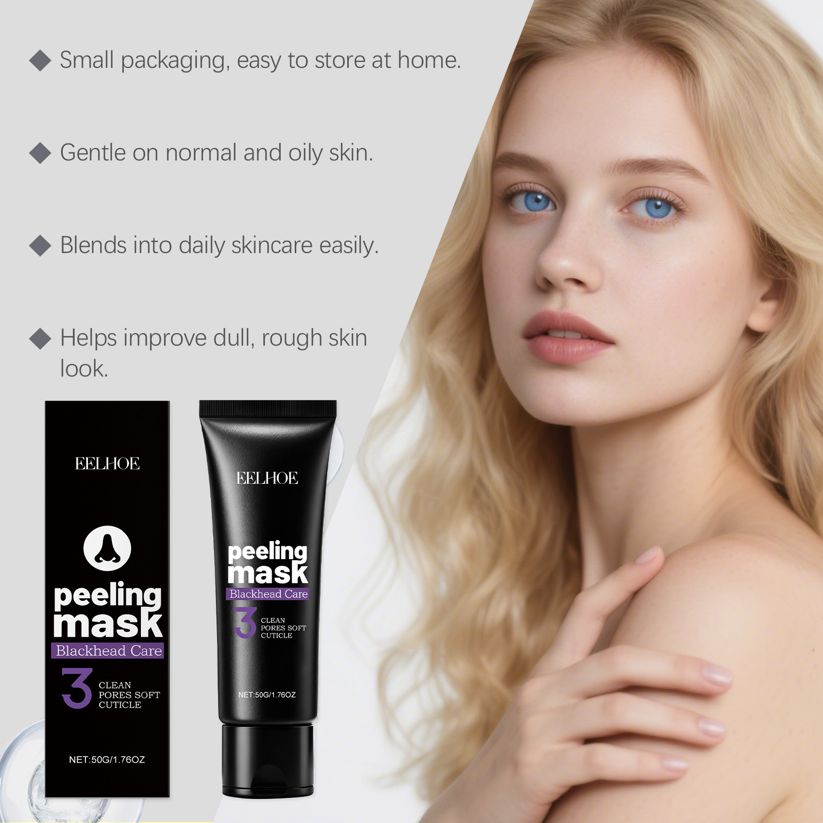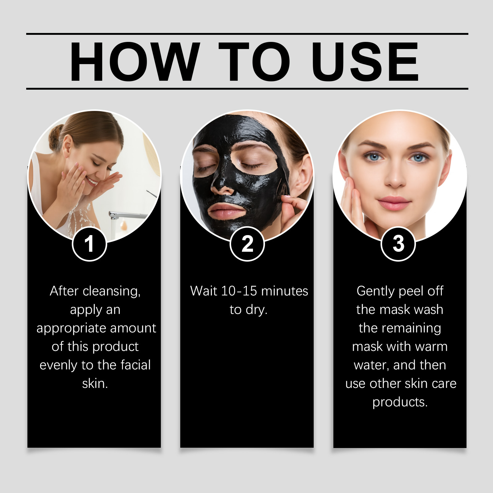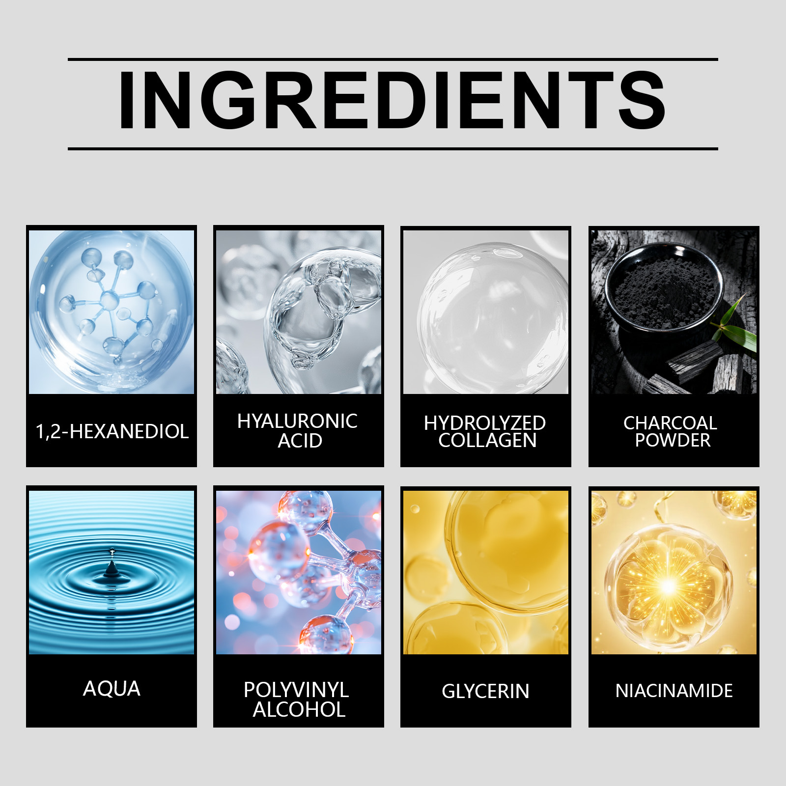 Inhaltsstoffe: Wasser, Polyvinylalkohol, Glycerin, Nicotinamid, 1,2-Hexandiol, Hyaluronsäure, hydrolysiertes Kollagen, Bambuskohlepulver.