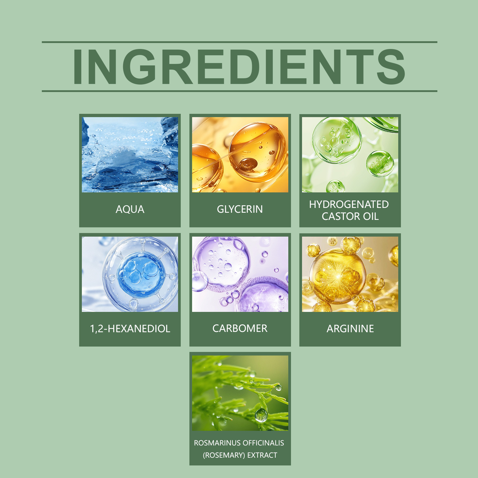 Inhaltsstoffe: Wasser, Glycerin, hydriertes Rizinusöl, 1,2-Hexandiol, Carbomer, Arginin, Rosmarinextrakt