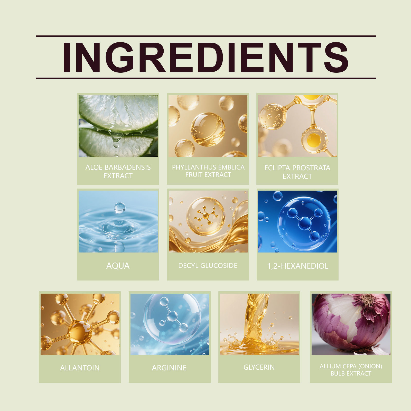 Zutaten: Wasser, Decylglucosid, Glycerin, Aloe-vera-Extrakt, 1,2-Hexandiol, Allantoin, Arginin, Phyllanthus-emblica-Extrakt, Schlangenkopf-Darmextrakt, Zwiebelextrakt.