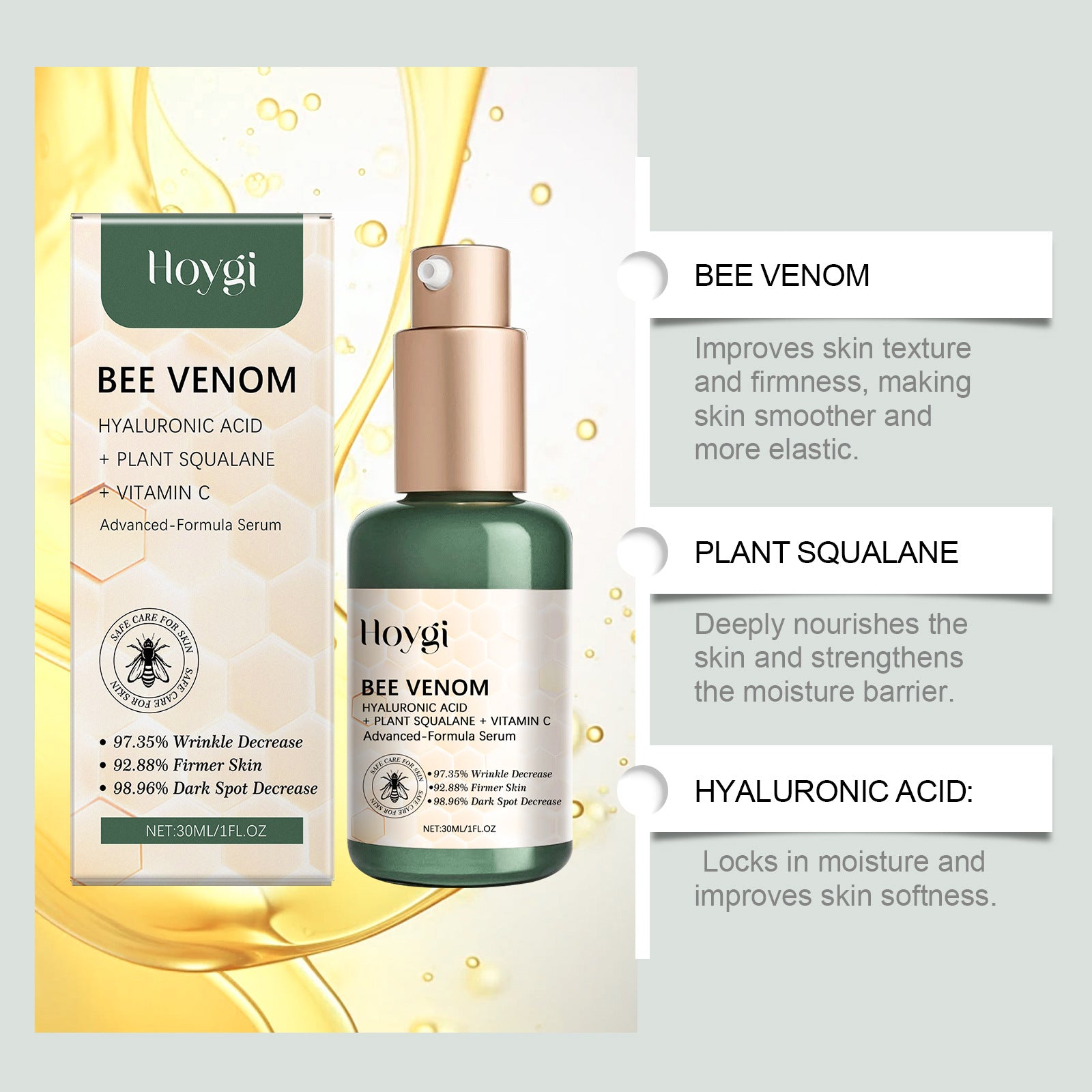 Inhaltsstoffe: Wasser, Glycerin, Hydroxyethylcellulose, Bienengift, Squalan, Hyaluronsäure, Vitamin C (Ascorbinsäure)