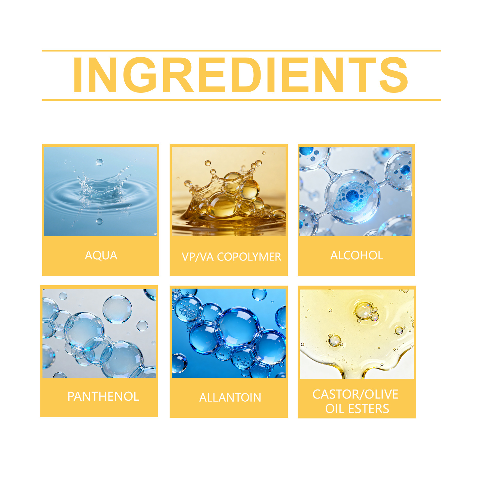 Inhaltsstoffe: Wasser, VP/VA-Copolymer, Ethanol, Panthenol, Allantoin, Rizinusöl/Olivenölester.