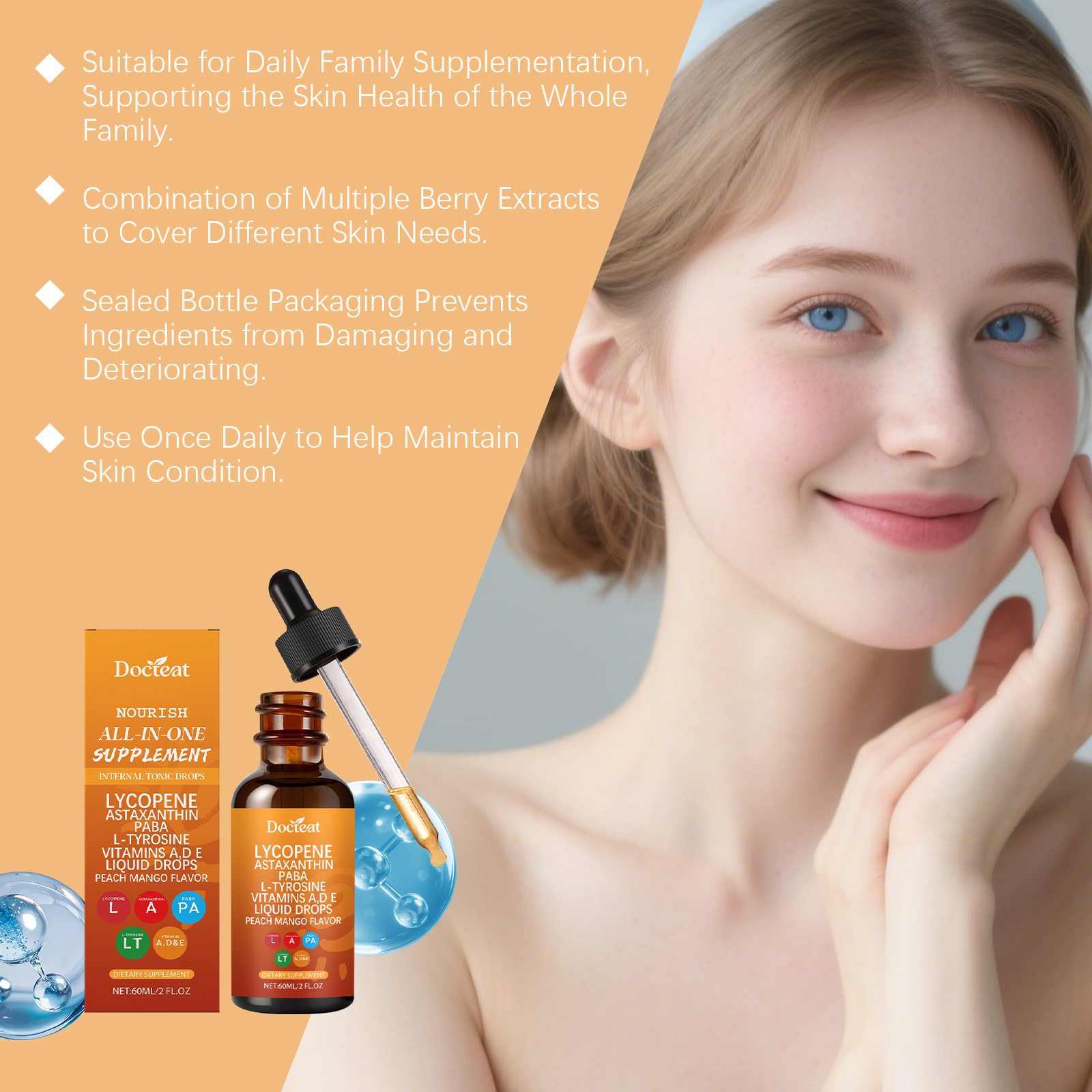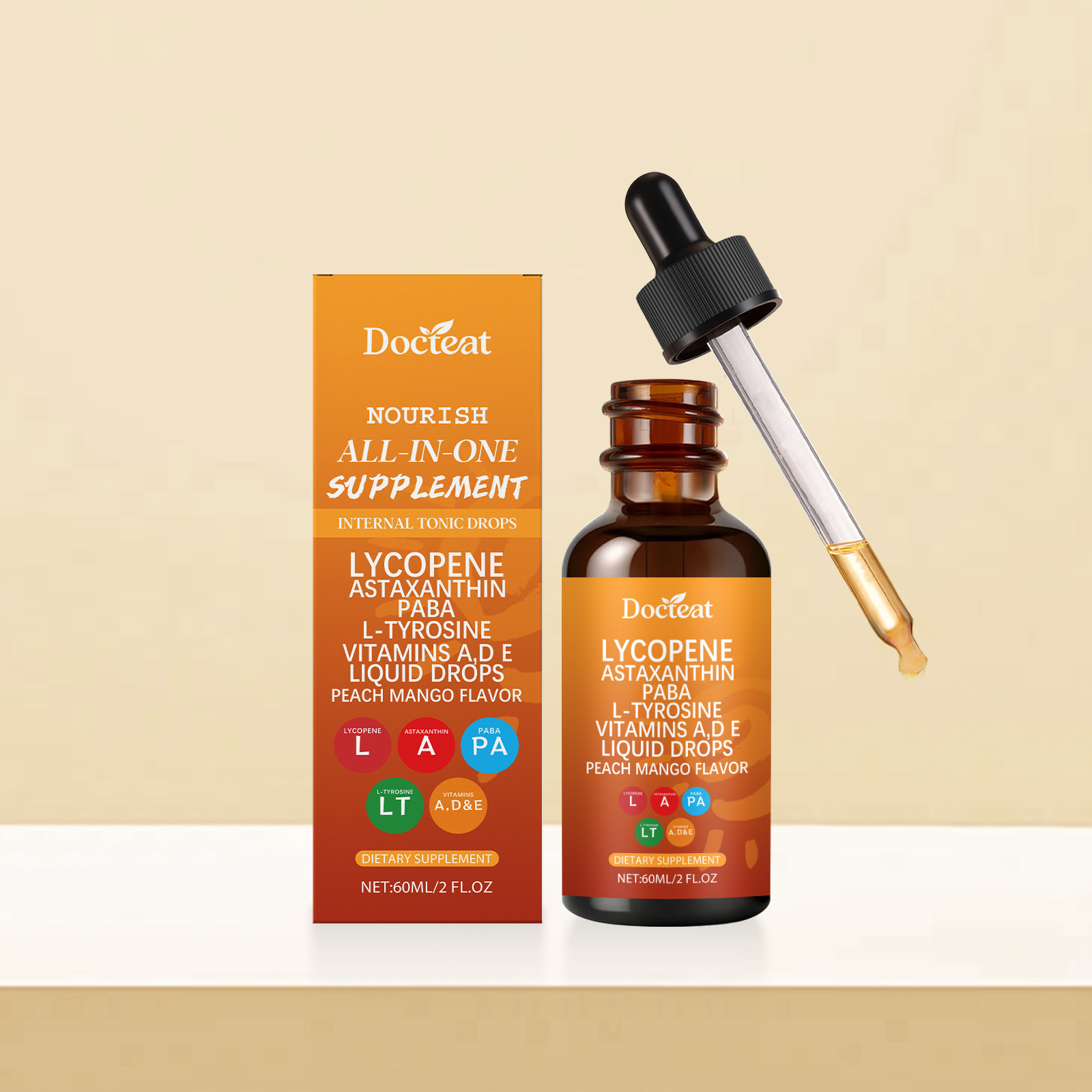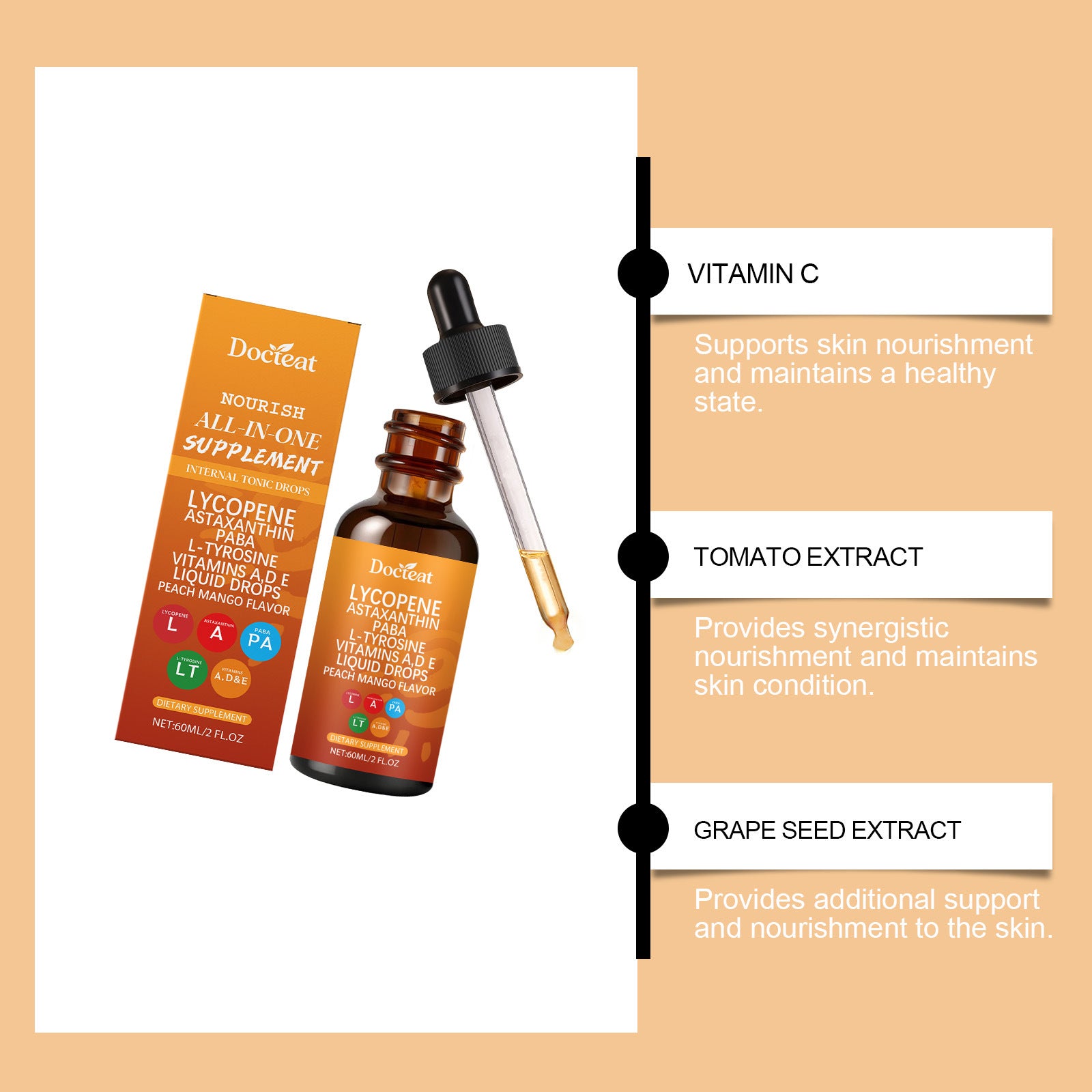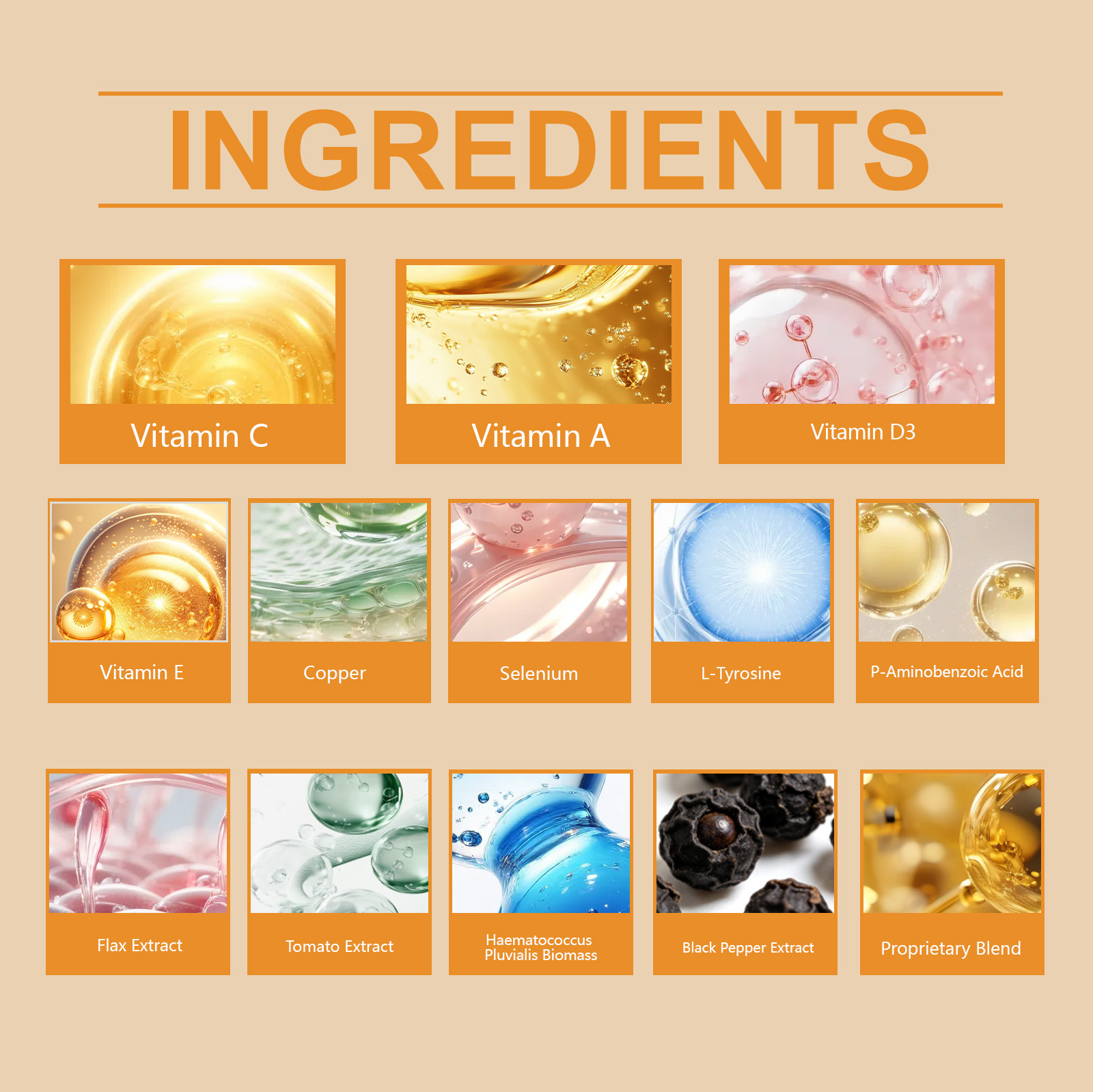 Zutaten: Vitamin C, Vitamin A, Vitamin D3, Vitamin E, Kupfer, Selen, L-Tyrosin, p-Aminobenzoesäure, Leinsamenextrakt, Tomatenextrakt, Haematococcus pluvialis-Pulver, schwarzer Pfefferextrakt, firmeneigene Formel (Pteris polyphemus-Extrakt, Traubenkernextrakt, Methylsulfonylmethan, Centella asiatica, Phyllanthus emblica).