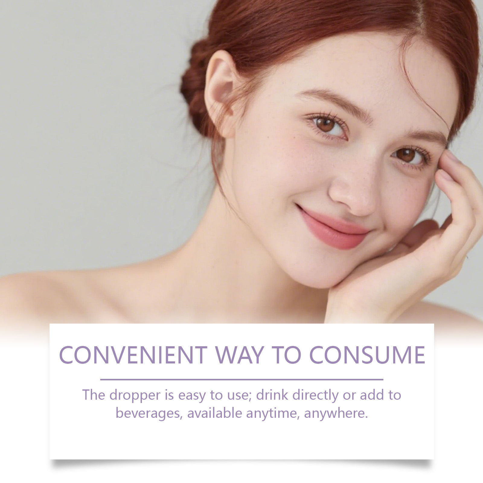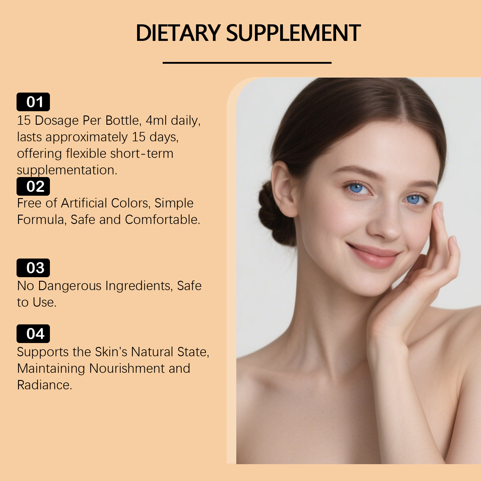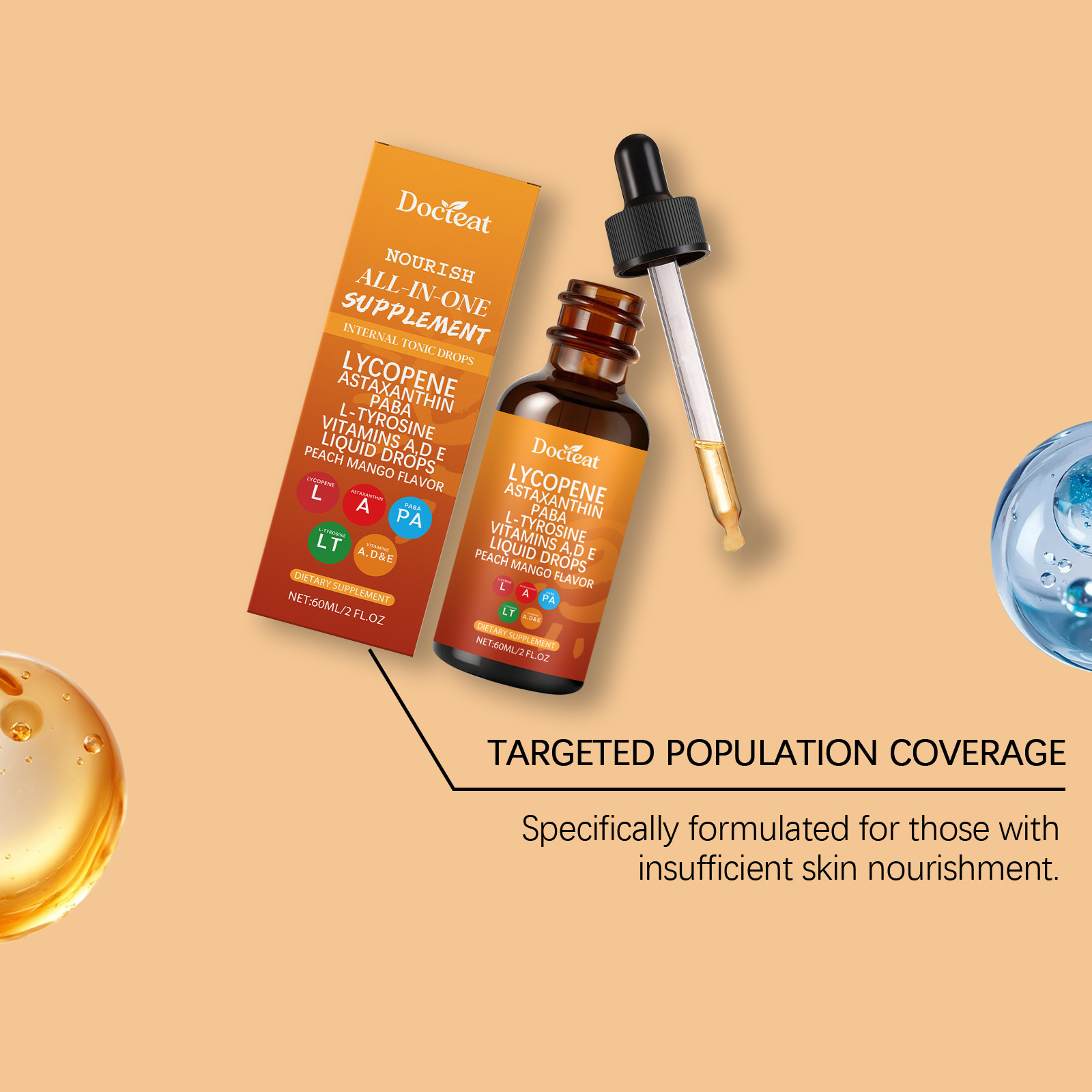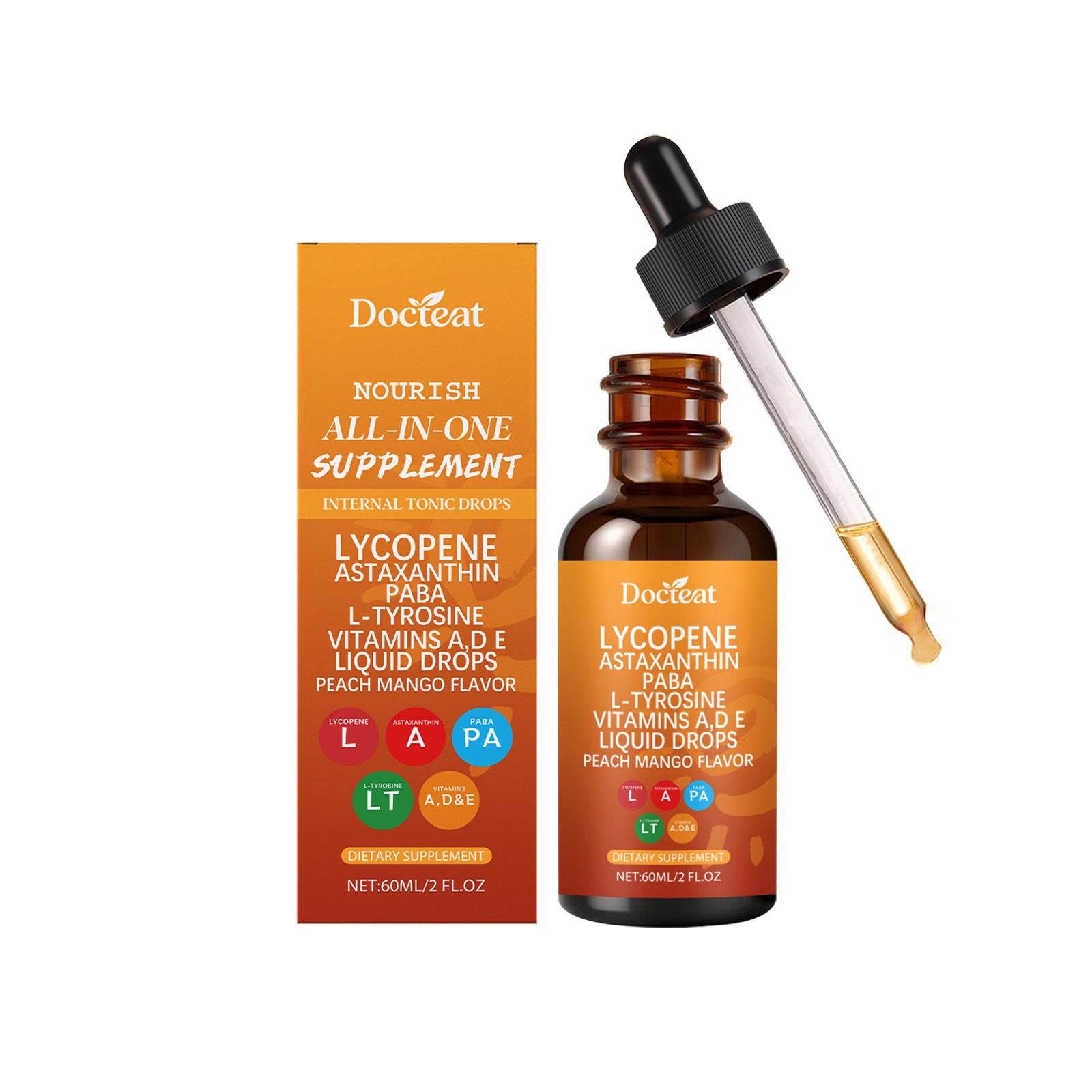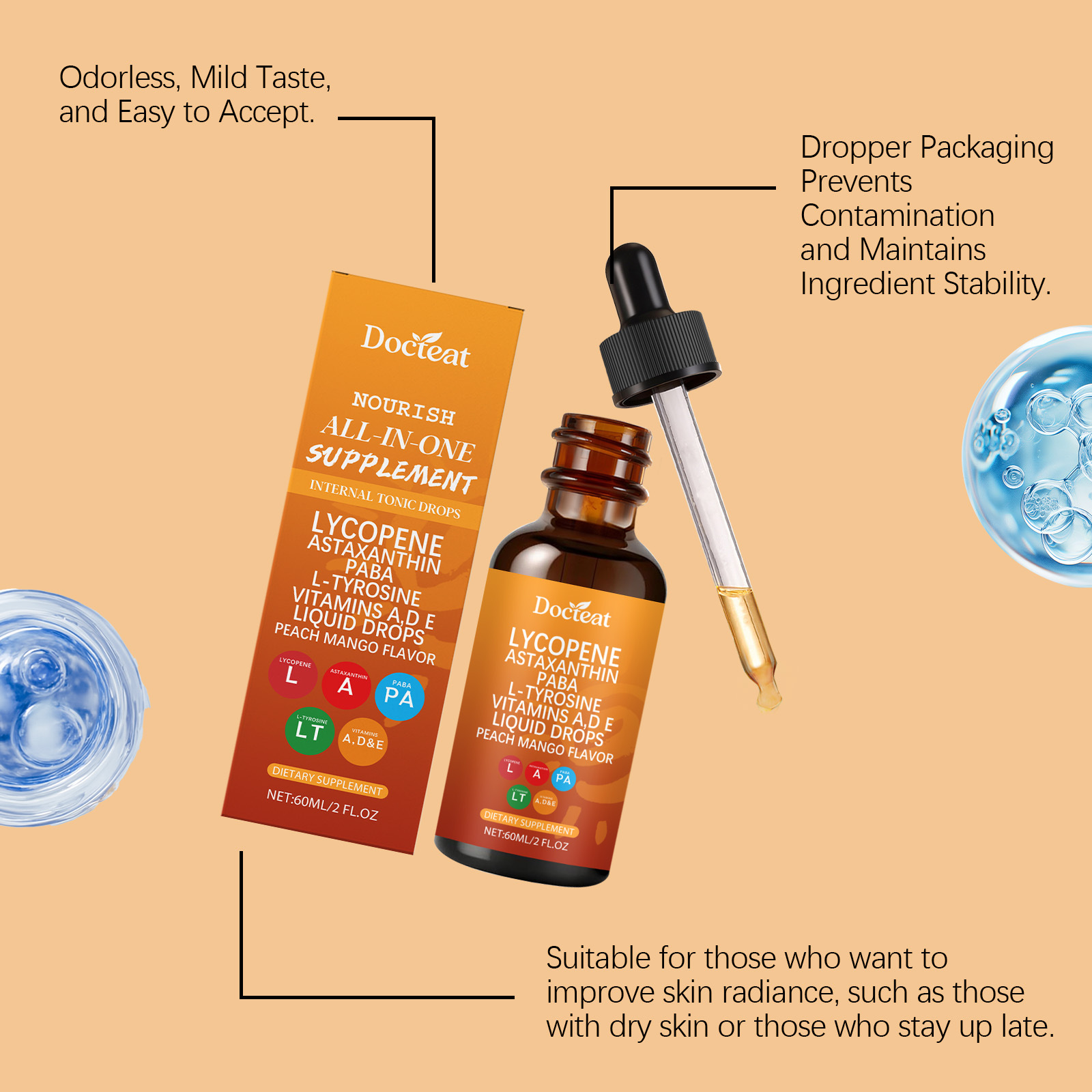 Zutaten: Vitamin C, Vitamin A, Vitamin D3, Vitamin E, Kupfer, Selen, L-Tyrosin, p-Aminobenzoesäure, Leinsamenextrakt, Tomatenextrakt, Haematococcus pluvialis-Pulver, schwarzer Pfefferextrakt, firmeneigene Formel (Pteris polyphemus-Extrakt, Traubenkernextrakt, Methylsulfonylmethan, Centella asiatica, Phyllanthus emblica).