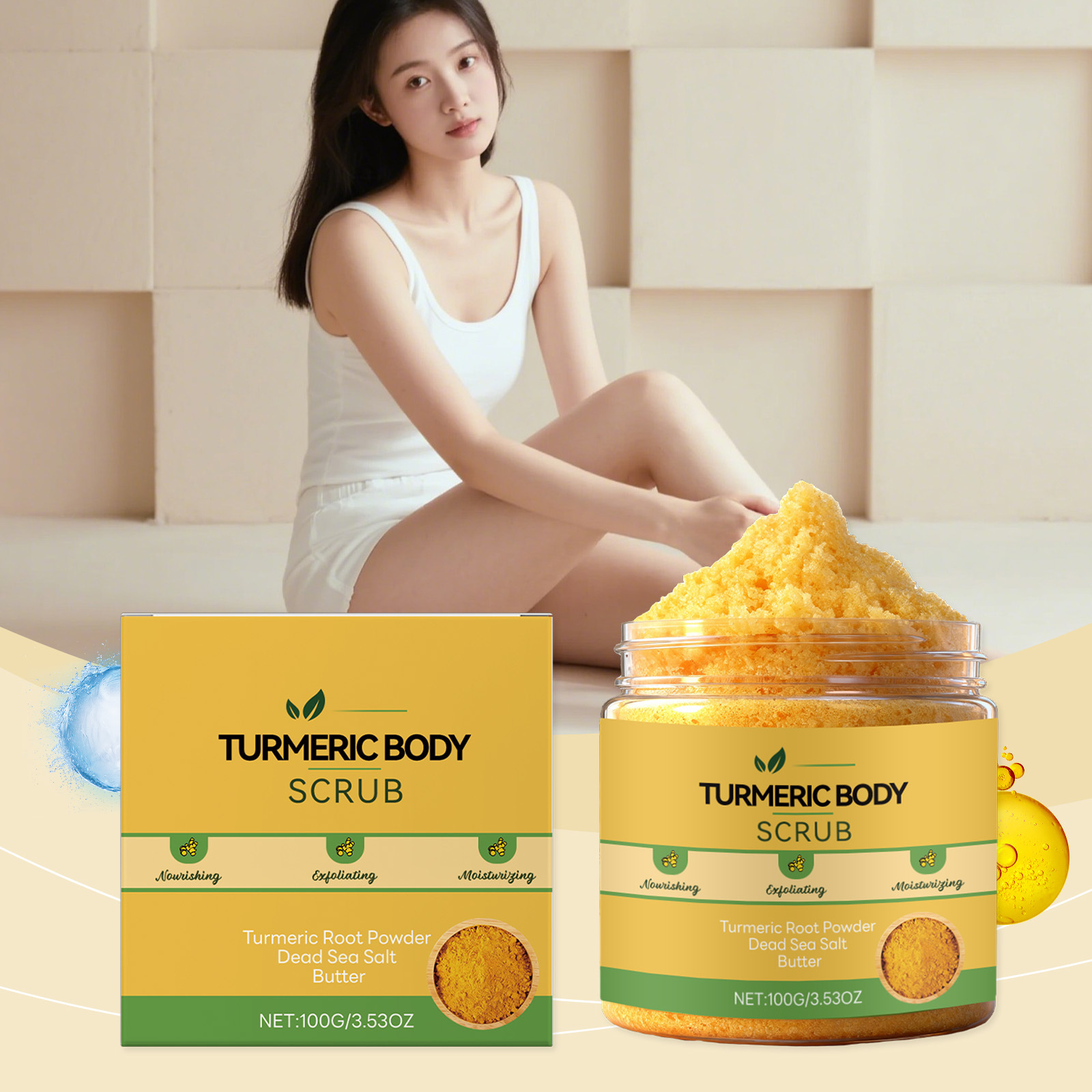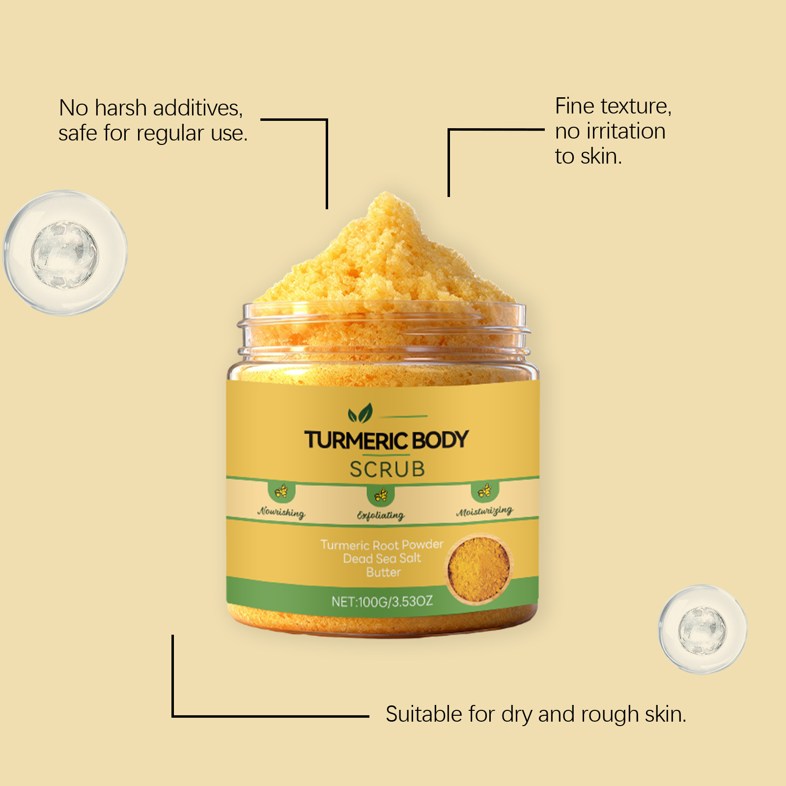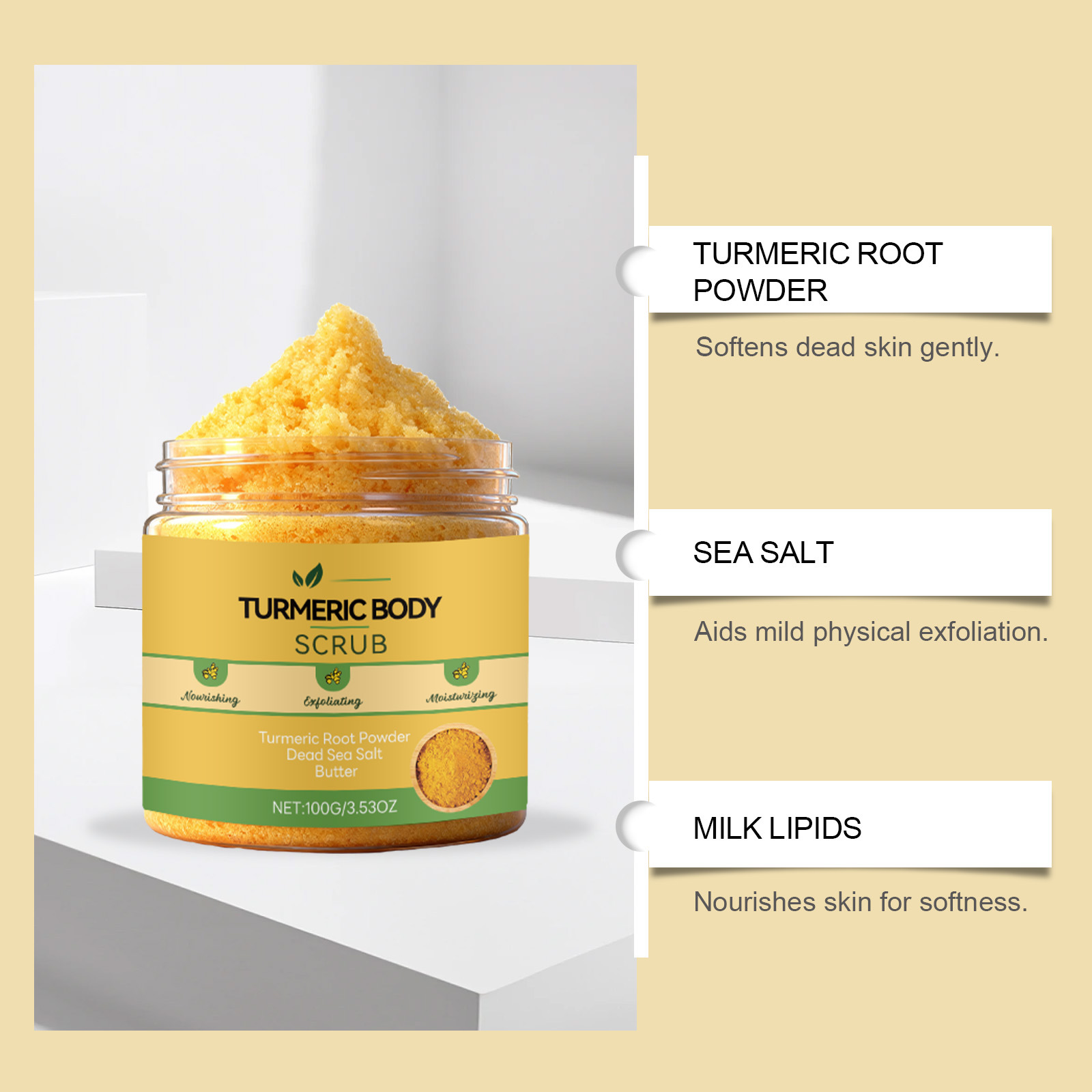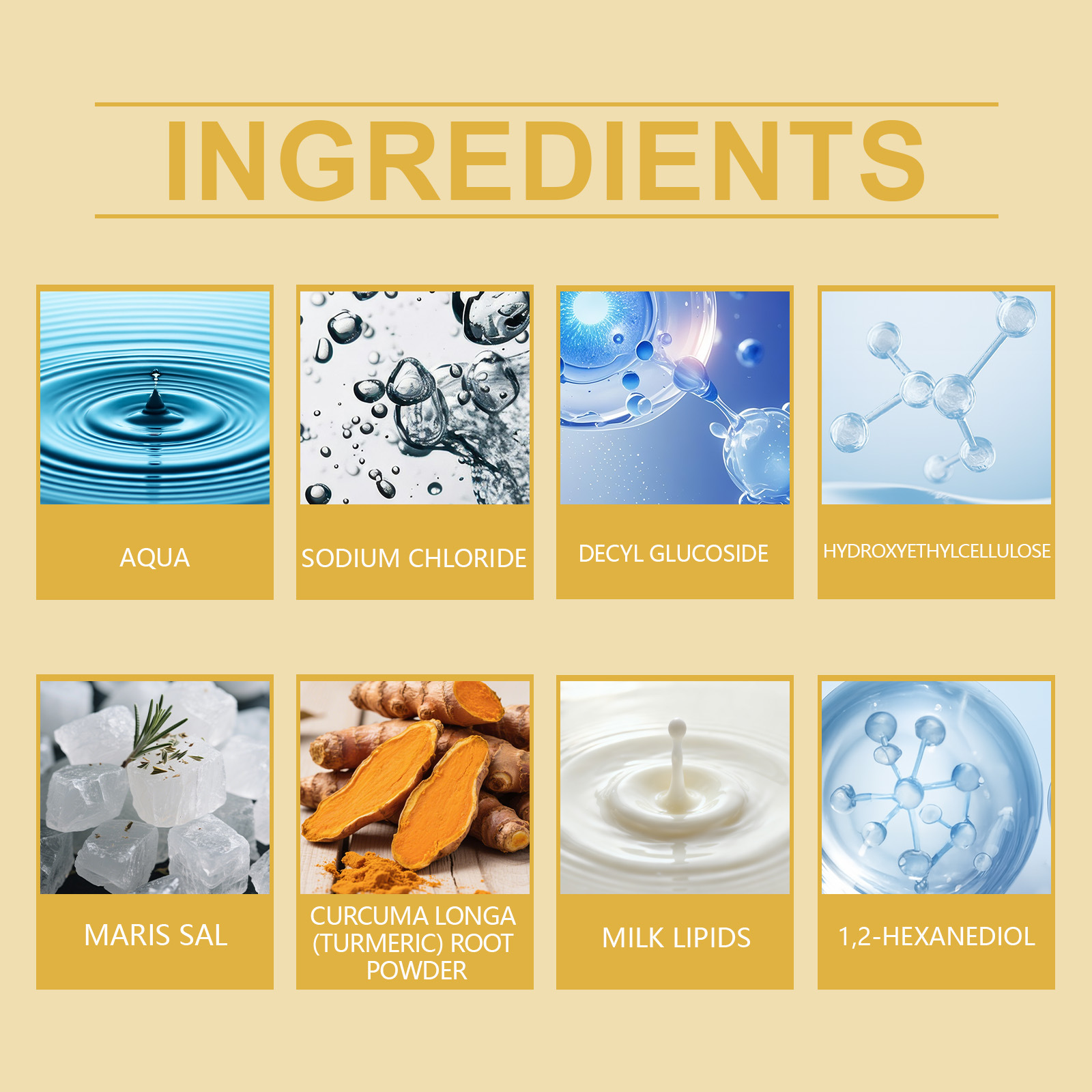 Zutaten: Wasser, Natriumchlorid, Decylglucosid, Hydroxyethylcellulose, 1,2-Hexandiol, Meersalz, Kurkumawurzelpulver, Milchfett.